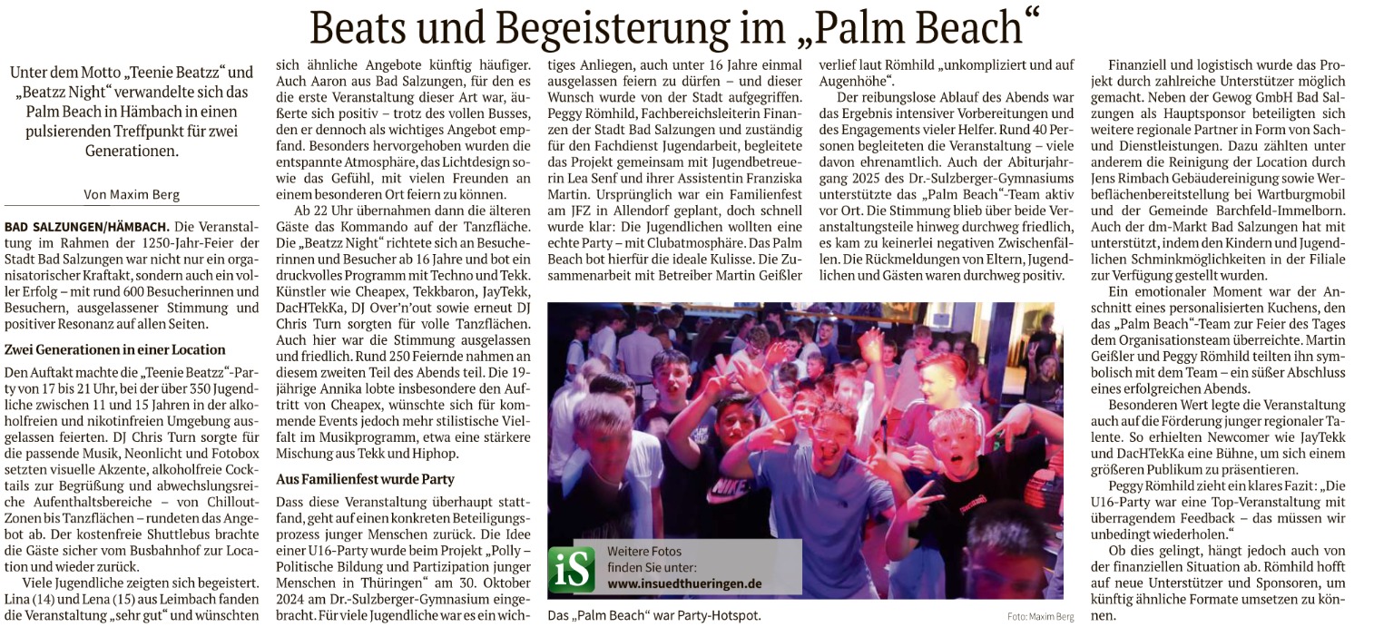 Der Round-Table-Tag in Bad Salzungen fand am Dr. Sulzberger-Gymnasium statt. In verschiedenen Workshops zum Stadtfest Bad Salzungen, zu jugendgerechten Orten und Freizeitgestaltung und dem Thema Schul-Gestaltung haben sich junge Menschen aus Bad Salzungen und Umgebung mit Fragen auseinandergesetzt, die wir vorher von Schule und Stadt eingeholt haben und Ideen und Forderungen zu den jeweiligen Themen entwickelt. Auf dem Abschlussplenum haben sie diese dann mit Vertreter*innen von Schule und Stadt diskutiert.